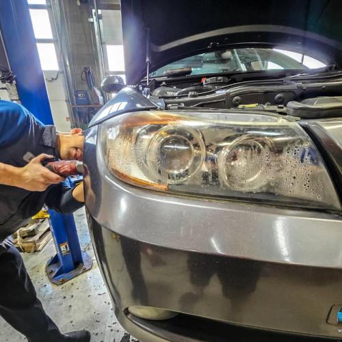 This BMW had both headlights logged with water and we replaced them. A bumper removal is required!